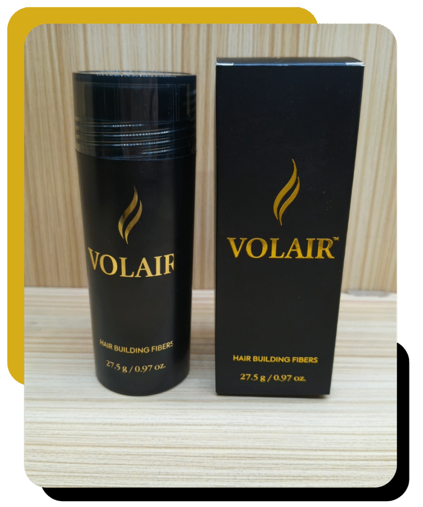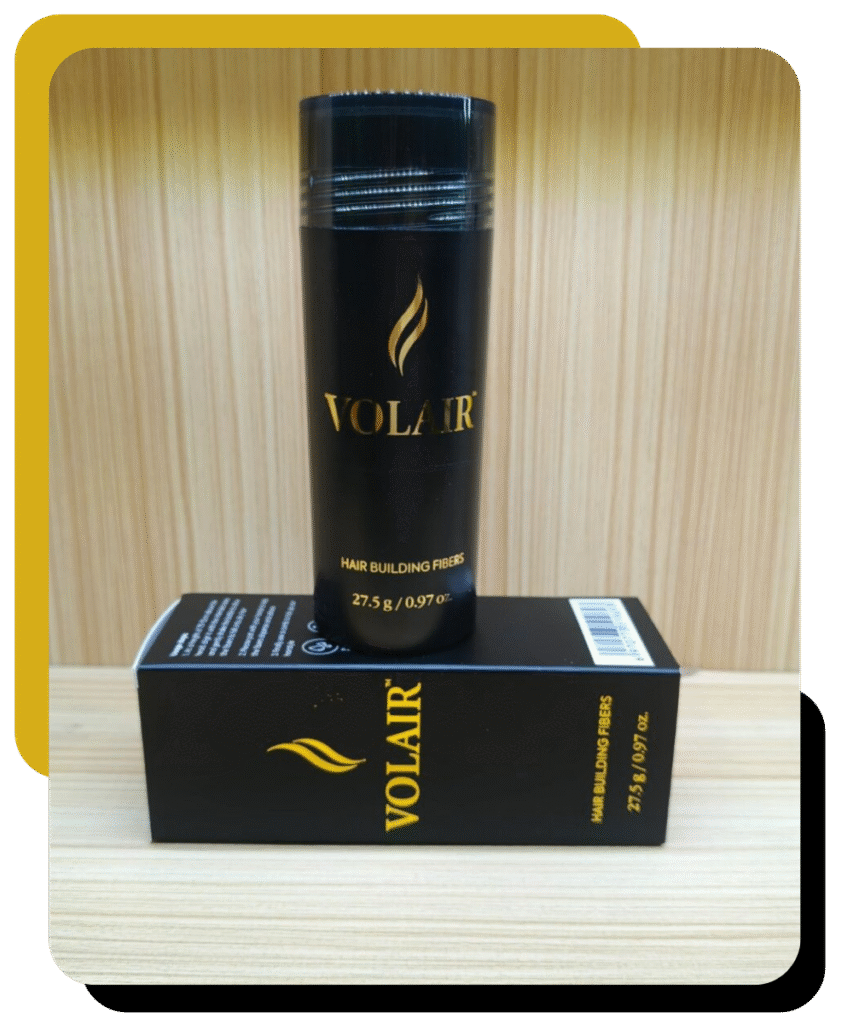 VOLAIR gives the instant appearance of a thick, full head of hair. VOLAIR Hair Building Fibers are made from natural keratin of the highest grade — the same type of protein found in real hair. The fibers carry a strong natural static charge, creating a magnetic effect that tightly binds VOLAIR Hair Building Fibers to even the finest strands of human hair.